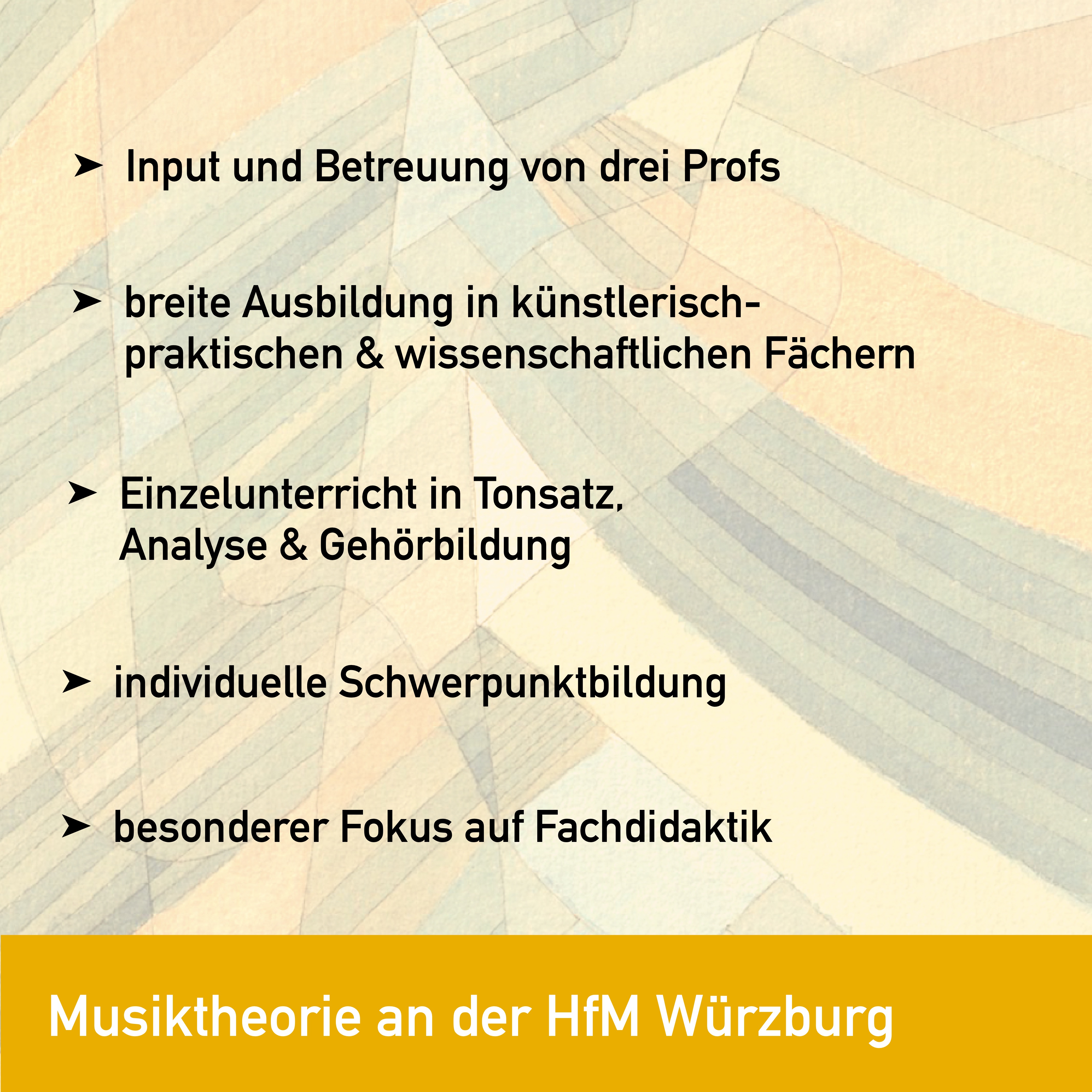 Musiktheorie als Hauptfach wird in Würzburg grundständig im Bachelor und aufbauend im Master angeboten. Außerdem gibt es die Möglichkeit, studien- oder berufsbegleitend ein Zertifikatsstudium in Tonsatz oder Gehörbildung zu absolvieren.