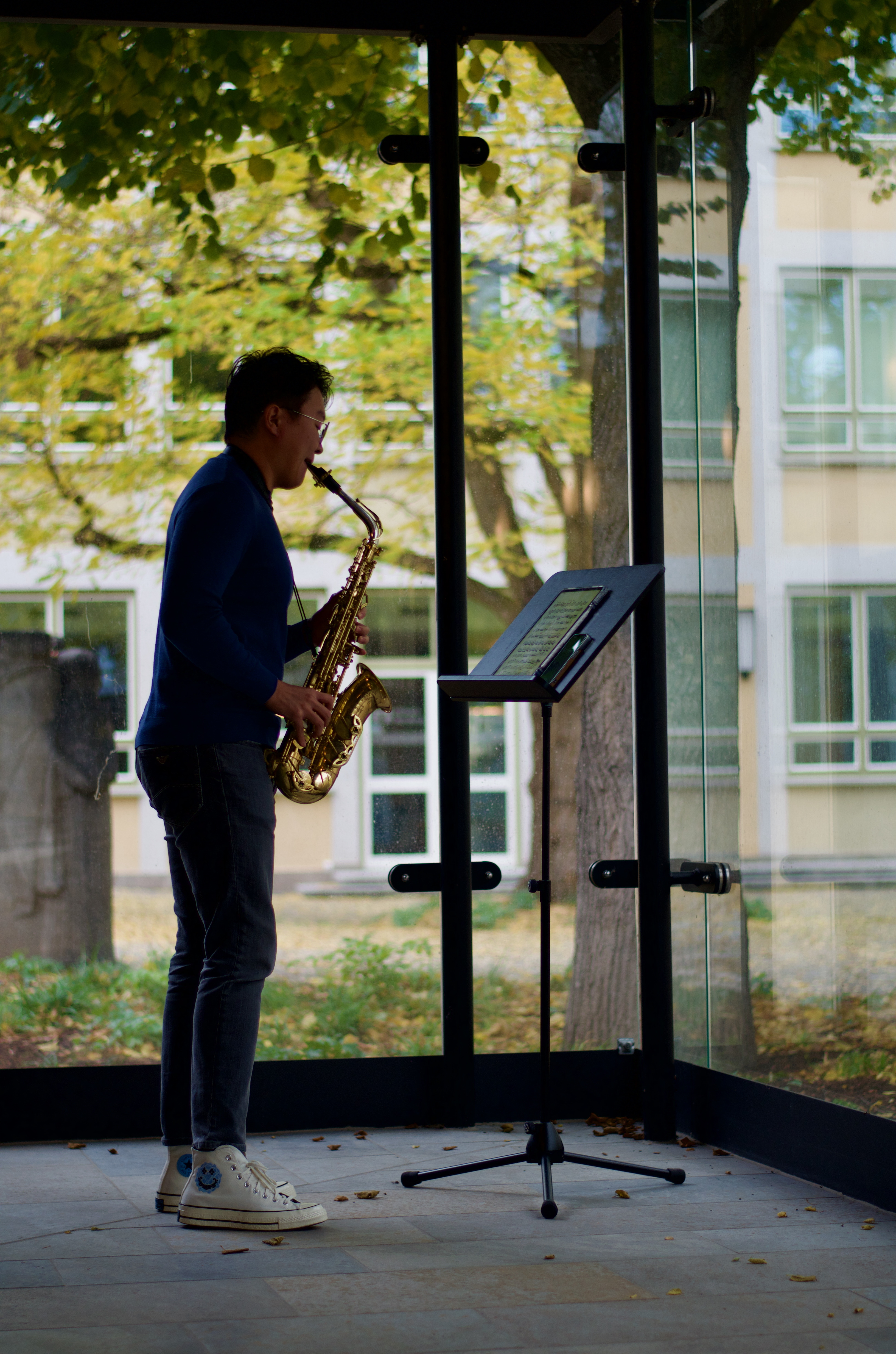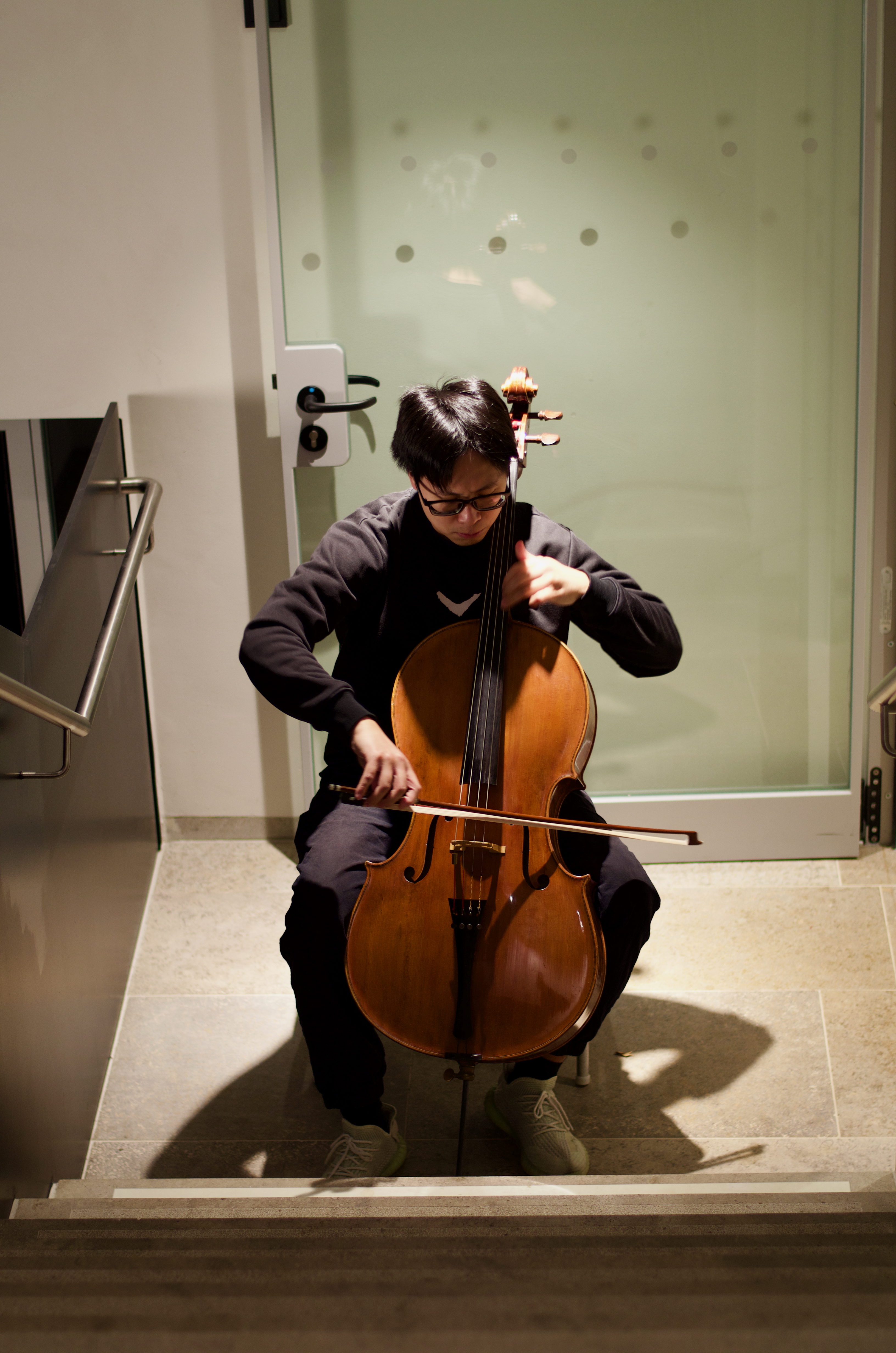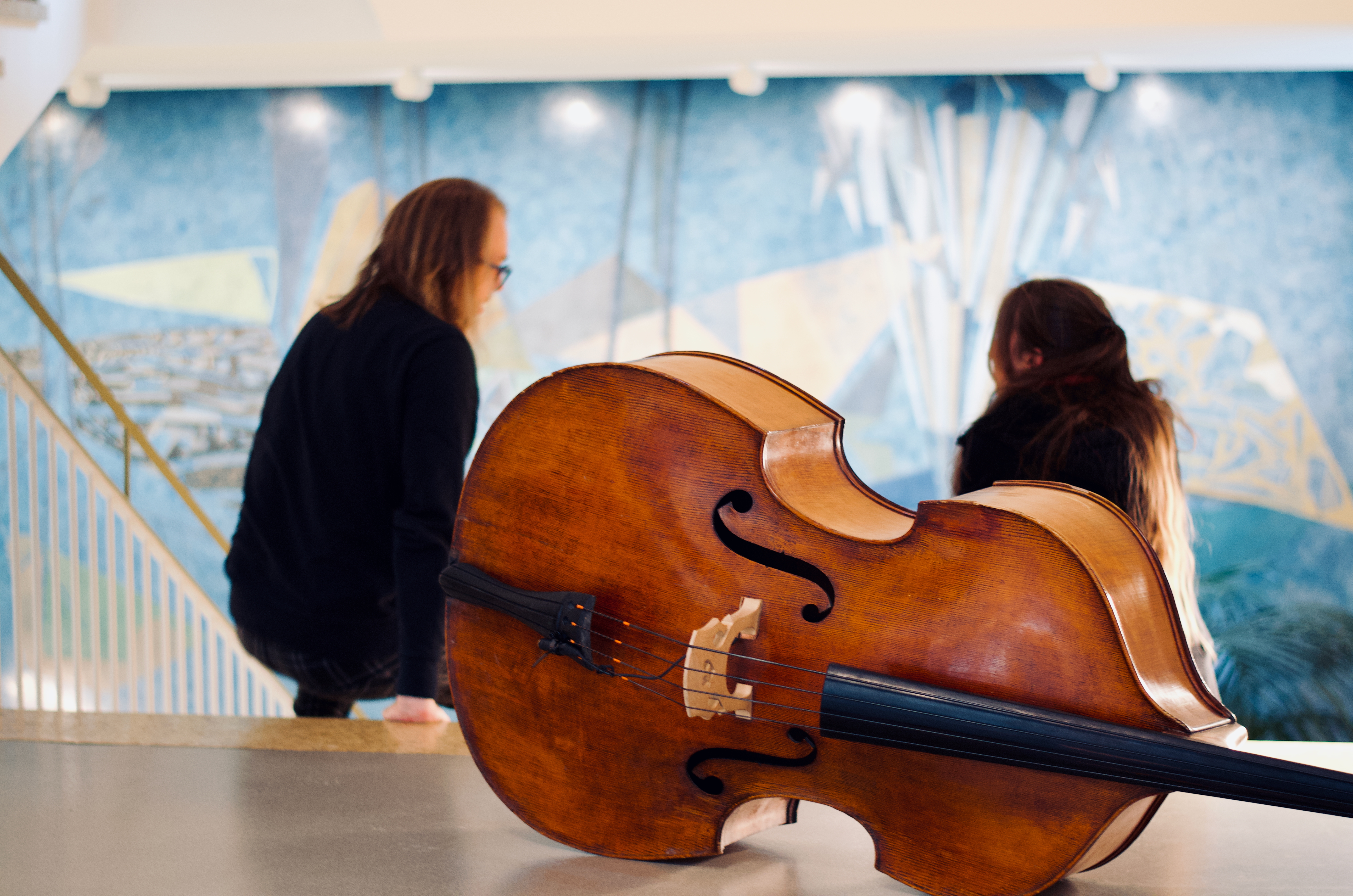 Studierende der HfM musizieren Solo-Werke und improvisieren gemeinsam in Räumen von Haus M und der gegenüber liegenden und architektonisch zugehörigen VR-Bank.