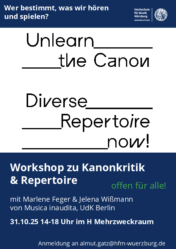 In unserem halbtägigen Workshop laden wir dazu ein, gemeinsam kritisch zu hinterfragen, welche Mechanismen, Traditionen und Machtstrukturen diese Kanons geprägt haben. Welche Stimmen und Werke wurden ausgeschlossen – und warum? Der Workshop richtet sich an alle, die Lust haben, Musikgeschichte und -gegenwart zu hinterfragen und eigene Perspektiven auf Vielfalt, Qualität und Bedeutung in der Musik zu entwickeln. Vorkenntnisse sind nicht notwendig – nur Neugier und Offenheit.