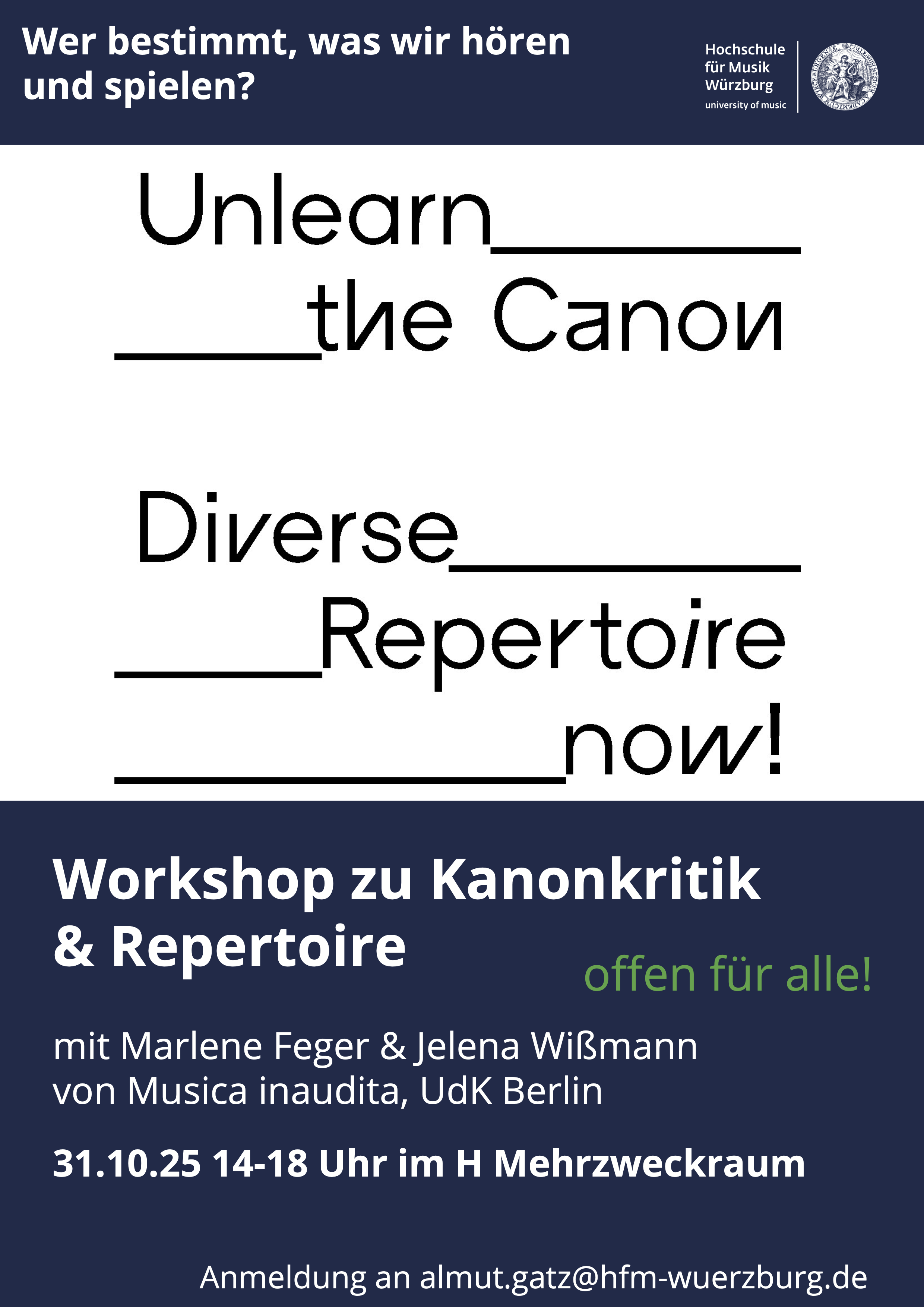 In unserem halbtägigen Workshop laden wir dazu ein, gemeinsam kritisch zu hinterfragen, welche Mechanismen, Traditionen und Machtstrukturen diese Kanons geprägt haben. Welche Stimmen und Werke wurden ausgeschlossen – und warum? Der Workshop richtet sich an alle, die Lust haben, Musikgeschichte und -gegenwart zu hinterfragen und eigene Perspektiven auf Vielfalt, Qualität und Bedeutung in der Musik zu entwickeln. Vorkenntnisse sind nicht notwendig – nur Neugier und Offenheit.